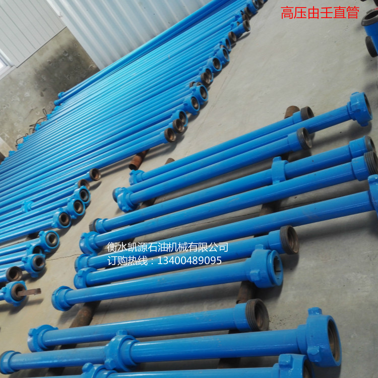 1.我公司設計制造的整體式高壓管線即高壓直管,國外稱短節(jié)。采用優(yōu)質合金結構鋼鍛造而成。端部由壬與直管鍛造成一整體,避免拆卸,密封性能極好,重量輕、使用方便、安裝快速。高壓直管規(guī)格有1"~4",額定工作壓力為42MPa~105MPa,長度有1英尺、2英尺、3英尺、4英尺、5英尺、6英尺等,可根據用戶需要提供各種規(guī)格及酸性環(huán)境下使用的高壓整體直管;